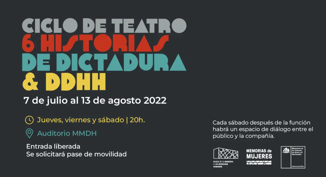 Luego de dos años de pandemia, el Museo vuelve con todo al teatro presencial, con el ya tradicional ciclo 6 Historias de Dictadura y Derechos Humanos. Las seis compañías nacionales que participan en esta edición mostrarán obras con diversas propuestas narrativas y en distintos formatos, que abordan desde el exilio hasta la declaración de Estado de Sitio durante el estallido social en 2019.