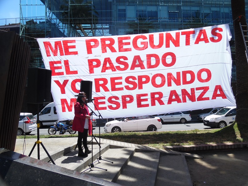 Desplegado entre dos palmeras, como una vela al viento, la frase del poema “Diálogo” de la poetisa chilena Stella Díaz Varín, nos interpela y nos conduce necesariamente a navegar por el tormentoso mar de la memoria, pero no para quedarnos en el dolor, sino para continuar con esperanza la lucha en contra de la impunidad, la lucha por el rescate de las historias de vida y el reconocimiento como luchadores sociales de las compañeras y compañeros ejecutados políticos.