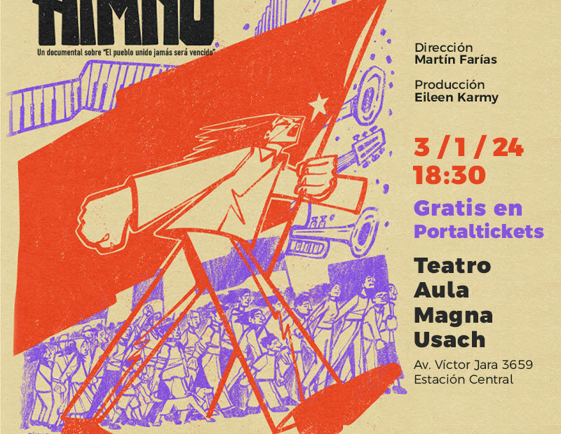 El documental Himno, que muestra como la canción “El pueblo unido jamás será vencido” se expandió por todo el mundo, se exhibirá el próximo miércoles 03 de enero en el Aula Magna de la Universidad de Santiago a las 18:15 horas (Av. Víctor Jara 3659, Metro Universidad de Santiago, Estación Central).