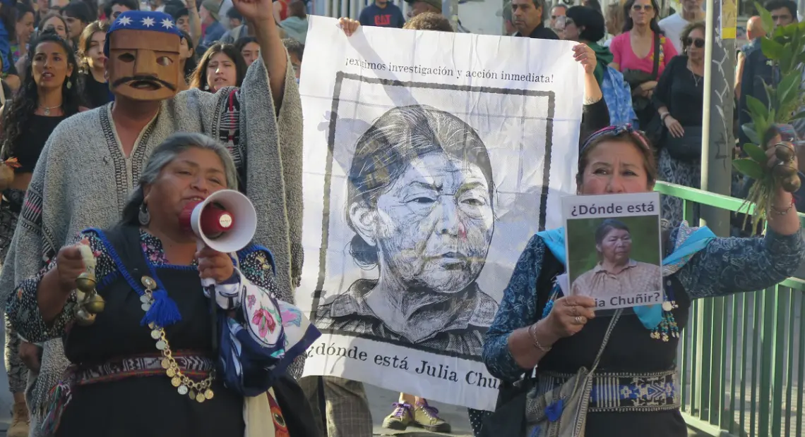Al cumplirse dos meses de la desaparición de Julia Chuñil Catricura, de la comunidad de Putreguel, comuna de Máfil, Región de los Ríos, diversas organizaciones mapuche, territoriales, ambientales, ecologistas y sociales convocaron a manifestarse a nivel nacional para exigir al gobierno y a las instituciones del Estado el esclarecimiento rápido y total de este brutal caso que lleva nuestra memoria hacia la oscura y siniestra época de la dictadura.