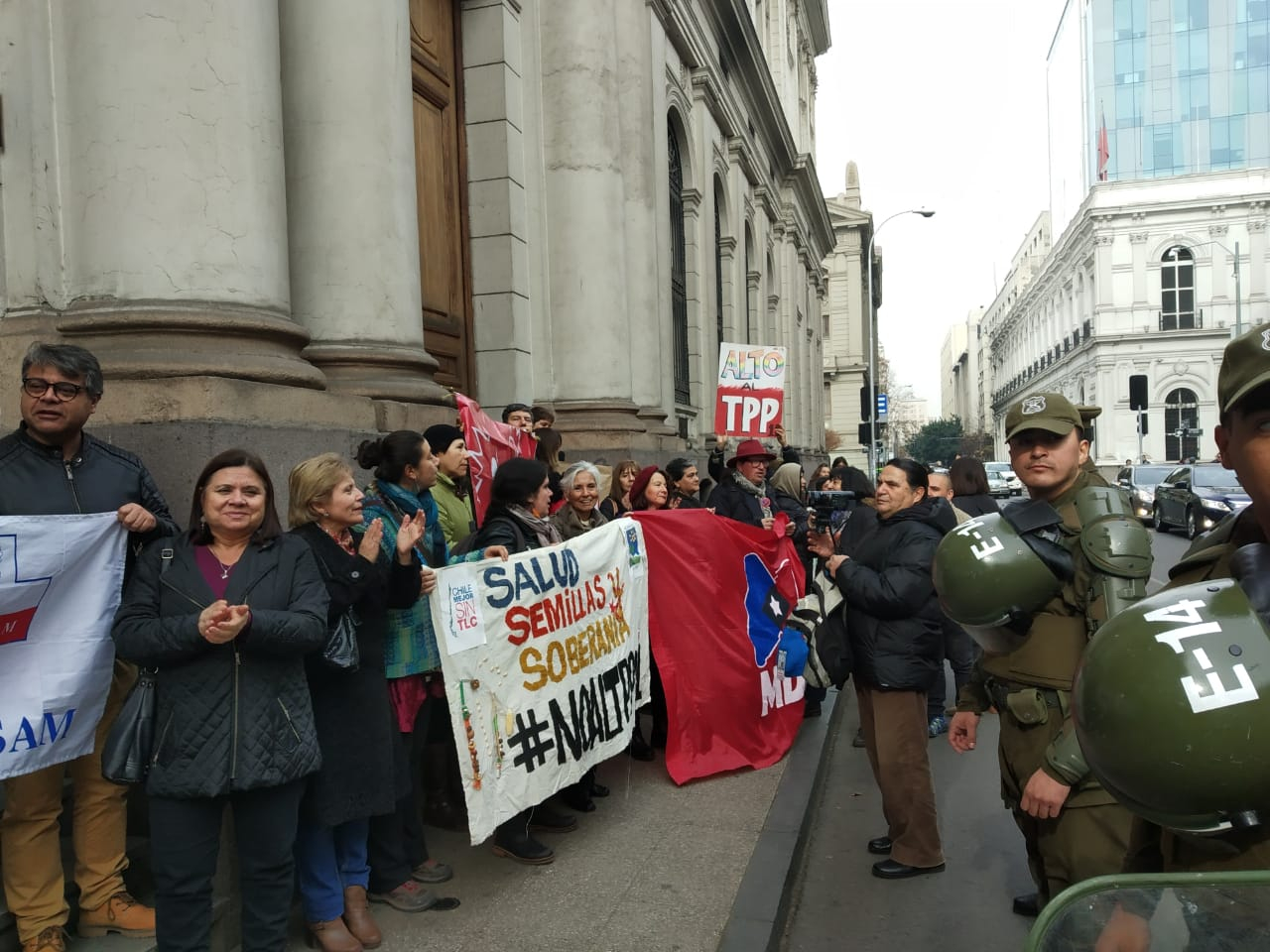 A mediodía del miércoles 26 de junio, dirigentes sindicales y representantes de movimientos sociales y medioambientales se reunieron en el frontis de los Tribunales de Justicia de Santiago y luego marcharon hasta las oficinas del Senado para manifestarse en contra de la aprobación del Tratado Transpacífico TPP-11.