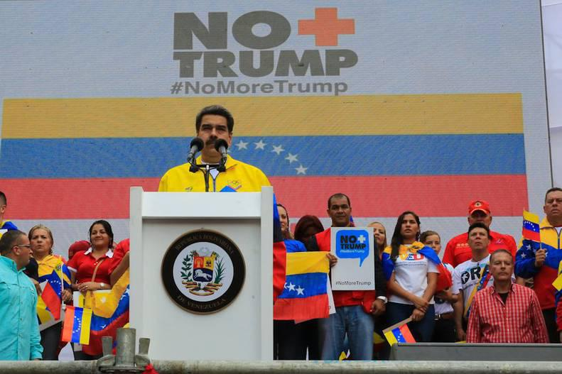 Medios de prensa y tuits de dirigentes bolivarianos reportan las multitudinarias concentraciones donde miles de venezolanos enarbolan banderas y carteles con la consigna No más Trump