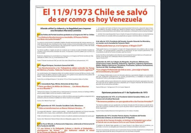 Esta mañana, la versión impresa del diario golpista publicó a página completa «Chile se salvó de ser como hoy es Venezuela», validando el actuar que tuvieron las fuerzas armadas y carabineros hace exactamente 46 años.