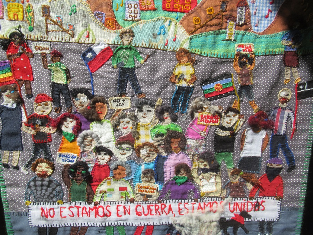 “Todas quedamos impactadas por la irrupción de esta enorme y variada protesta social. Lo que me pasó a mí, particularmente, fue que cuando estaba viendo en la televisión a Piñera y dice “estamos en guerra”, quedé como en estado de shock. No podía creer lo que estaba escuchando. Después vi por ahí la frase “no estamos en guerra, estamos unidxs”; eso lo junté con los caceroleos que se hacían a toda hora y lo con todo lo que pasaba diariamente, entonces me dije tengo que hacer una arpillera que refleje este momento. Muchas ideas vinieron a mi mente, pero por ahora las materialicé en esta arpillera y en otra que estoy terminando. Pero creo que serán muchas más las que elabore.