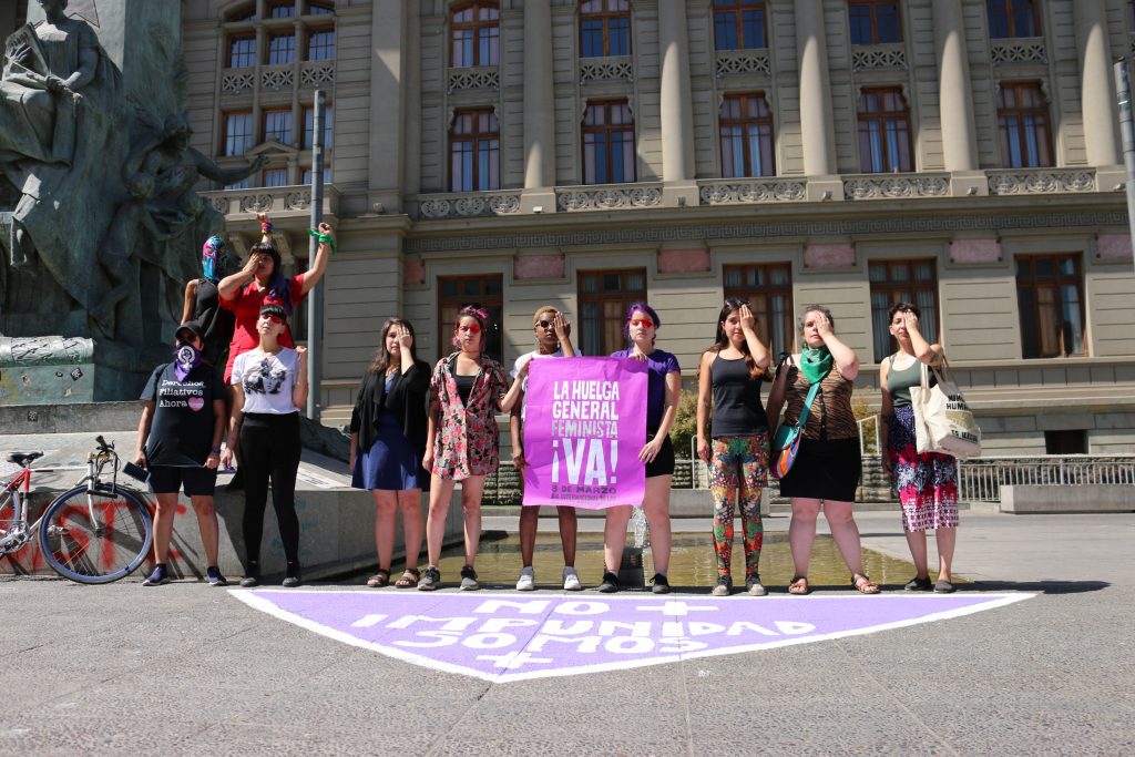 A un mes del 8 de marzo la Coordinadora Feminista 8M (CF8M), junto a distintas organizaciones convocantes, llamó a ser parte de un marzo feminista, que inició el 8 de febrero con pañuelazos realizados en distintas ciudades del país como Puerto Montt, Curicó, Antofagasta, Rancagua y Santiago. La intervención consignó los principales ejes en los que se apoya la Huelga General Feminista del 2020.