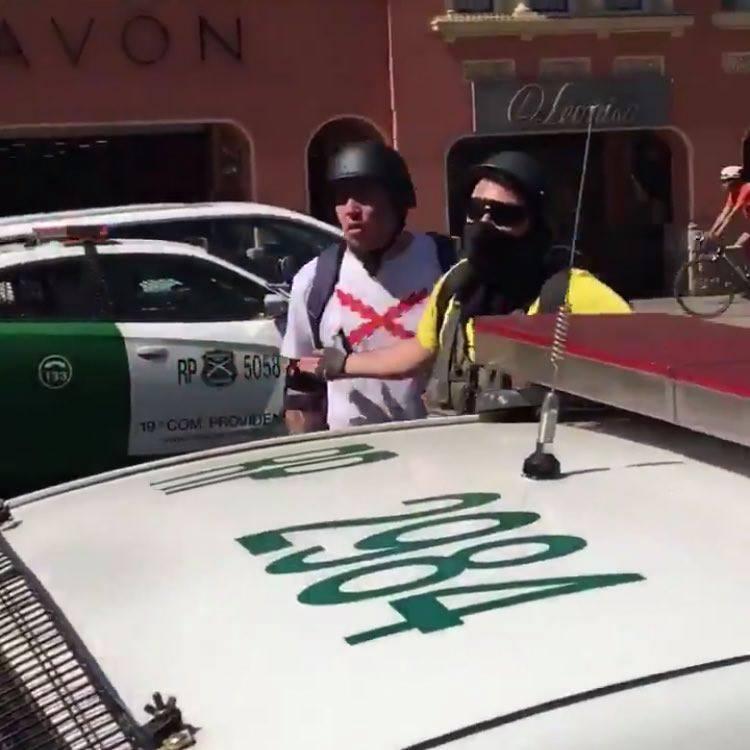En la marcha del rechazo, al lado de los autos de carabineros, uno de los manifestantes que andan con armas y cascos le tira gas pimienta a uno de los que estamos afuera de la marcha. Despues viene otro con chaleco antibalas y le pega un lumazo. ¿Y los pacos? Ni se movieron. pic.twitter.com/cTIhAITAGJ