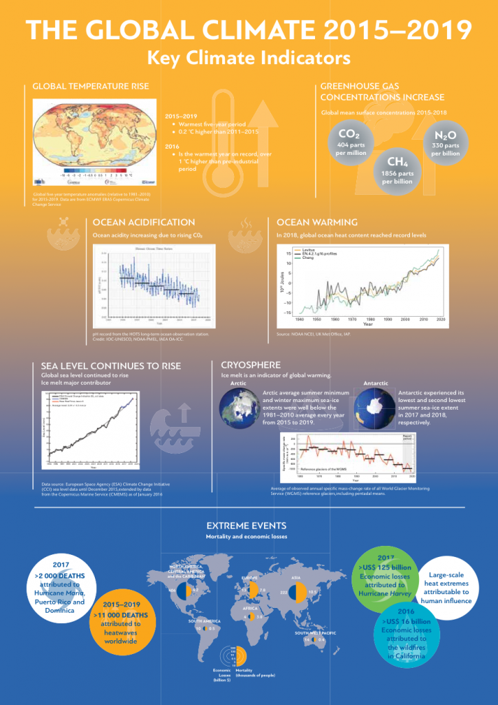 El informe de cinco años confirmó que 2015-2019 fue el período más cálido registrado. La temperatura global ha aumentado en 1.1 ° C desde el período preindustrial, y en 0.2 ° C en comparación con 2011-2015.