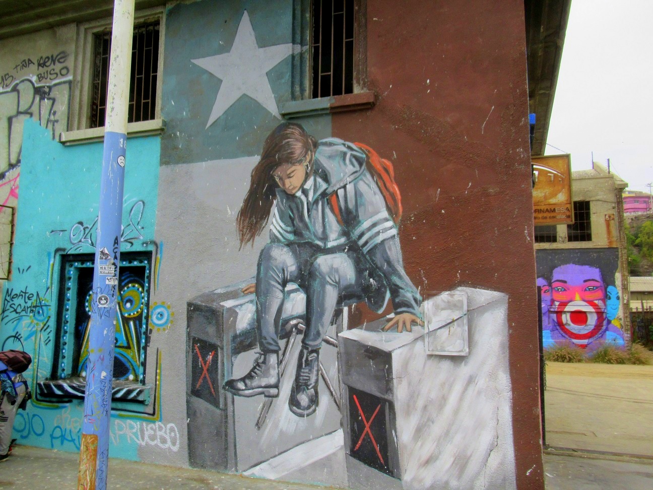 Luego hice otro representando a los muertos durante las protestas, por eso borde a Daniela Carrasco, «La Mimo» callejera, quien fue encontrada colgada de una reja, ahorcada, después de haber sido detenida por Carabineros. Aparece junto al ícono del «negro matapacos», reconocido por su apoyo a los estudiantes en las protestas 2011. Ambos se encuentran en el cielo. Tuvo muy buena acogida en la marcha del 8 M.Y ahora que estoy bordando en cuarentena hice el Principito rebelde, con una bomba de flor en la mano y una mascarilla pidiendo » Que lo esencial se vuelva VISIBLE «