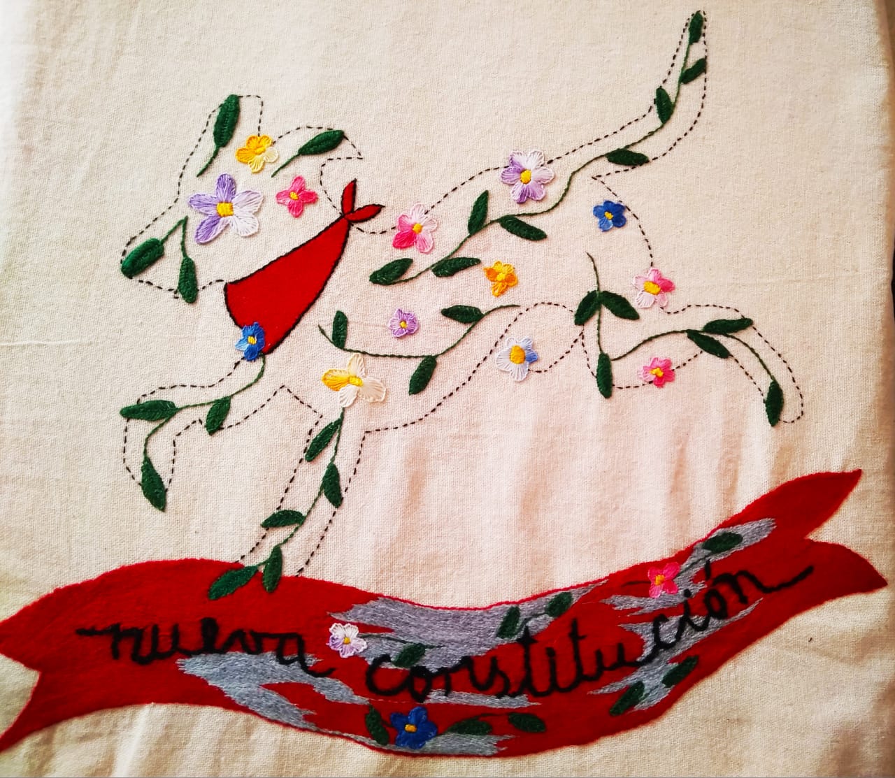 “Hoy, confinada en mi refugio, bordo una imagen histórica sobre las Jornadas de Trabajo Voluntario desarrolladas en el Gobierno Popular. He modificado su leyenda llamando a cambiar la Constitución impuesta en dictadura. Ha sido un trabajo lento, pero hermoso, pensando que esto se hará realidad a partir del plebiscito de octubre. Conectada con mis compañeras a través de redes sociales nos mantenemos en la lucha por cambiar los destinos de este azotado país. Estoy en un lugar donde la cobertura y señal telefónica no es la mejor, pero la conexión con las personas que amo y que tienen importancia en mi vida continúa a través del “Hilo Rojo”, como cuenta la leyenda, saltando mares, cerros y montañas. Nosotras volveremos a terminar lo comenzado en octubre 18. Lo prometemos!!!”
