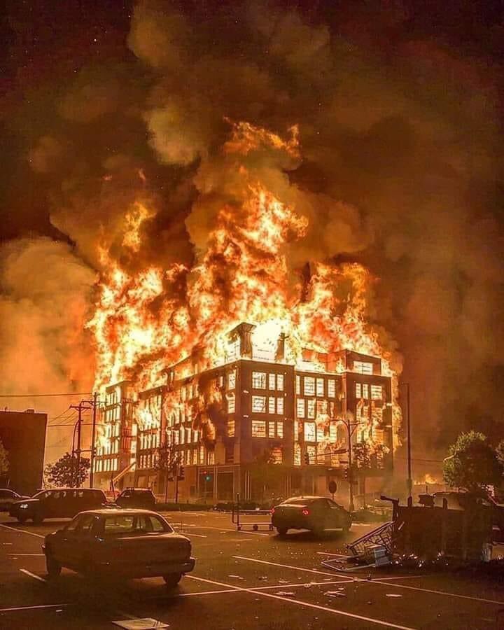 Asi amaneció EEUU tras las protestas masivas de anoche en Minneapolis, arrasada por la furia popular que ha atacado toda clase de negocios capitalistas.