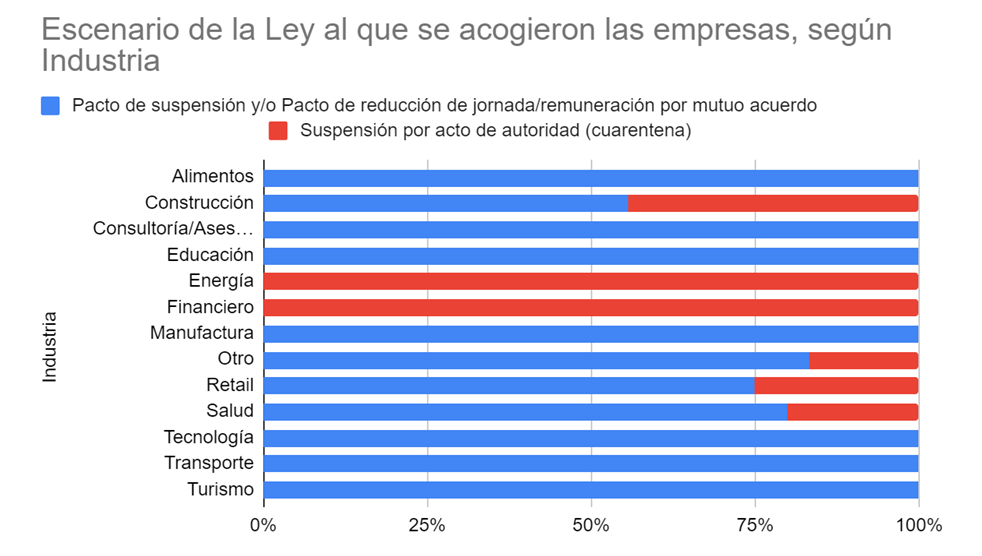 Del total de las empresas de la muestra, un 21% tuvo que acogerse por acto de la autoridad, de las cuales un 50% corresponde principalmente las micro y pequeñas empresas y un 30% corresponde a compañías de más de mil colaboradores. Dentro de la industria de la Construcción, un 44% de las empresas se vieron obligadas a acogerse por acto de autoridad, asimismo en el rubro del Retail, este porcentaje fue de un 25%.