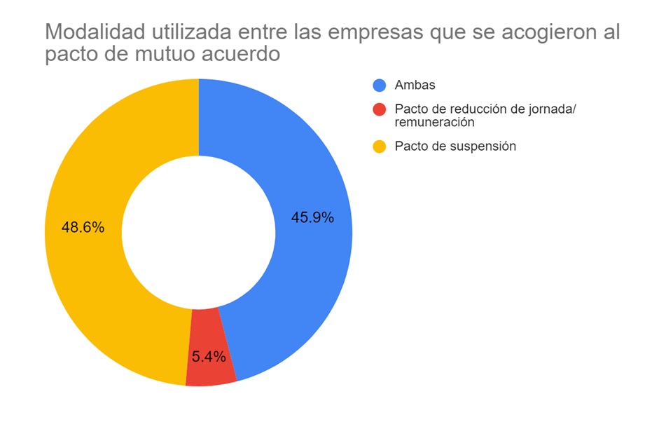 De quienes se acogieron al pacto de mutuo acuerdo, un 49% lo hicieron sólo por suspensión, 5% sólo por reducción de jornada laboral y un 46% utilizaron ambas modalidades. Un 64% de quienes se acogieron a la suspensión, fueron micro y pequeñas compañías y un 35% de las acogidas a ambas modalidades fueron las grandes.