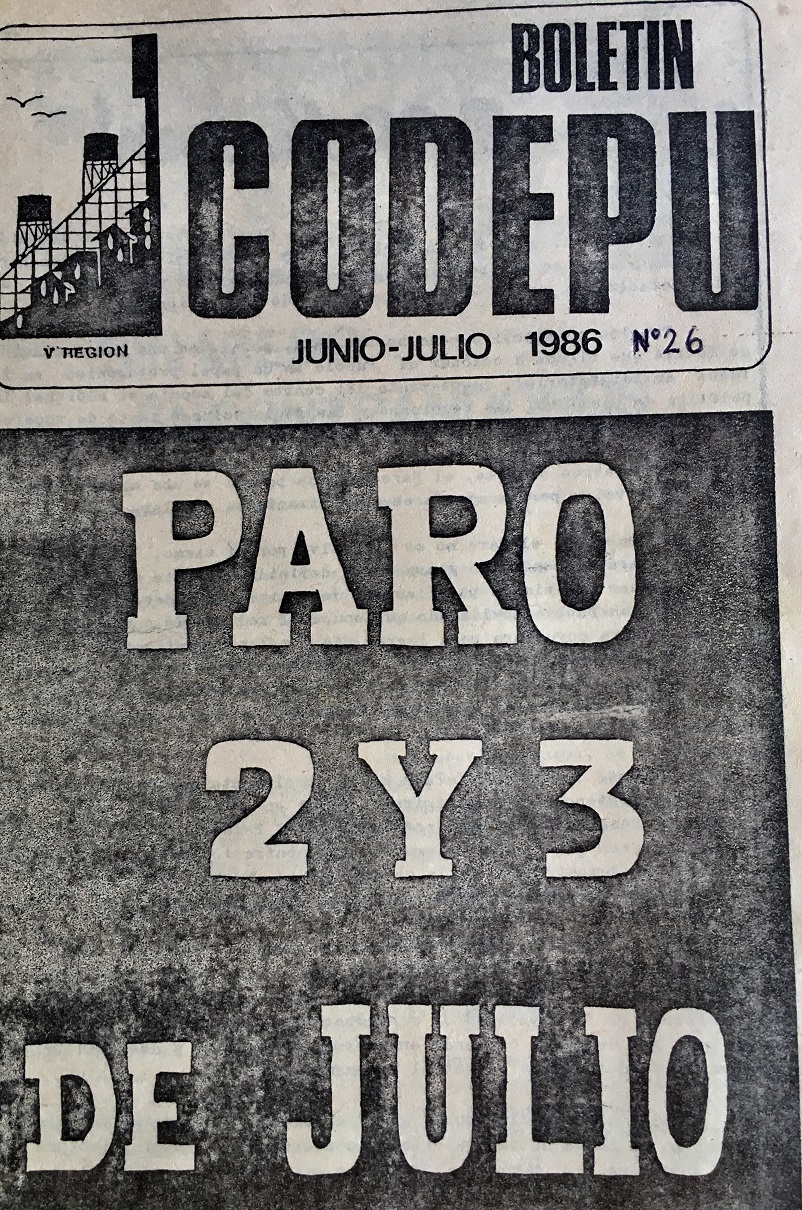 Una de las movilizaciones unitarias más importantes que se realizaron en el período de lucha en contra de la dictadura cívico militar encabezada por el dictador Augusto Pinochet, fueron las Jornadas de Paro Activo del 2 y 3 de julio del año 1986. Rescatando algunos elementos de la Memoria Histórica Popular, reproduzco a continuación la Editorial del Boletín N°26 del Comité de Defensa de los Derechos del Pueblo (CODEPU) V Región: