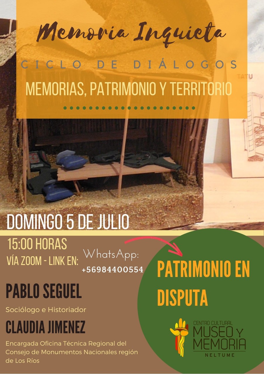 El Centro Cultural Museo y Memoria de Neltume continúa adelante con el desarrollo del “Ciclo de Encuentros de Memoria Inquieta”. El domingo 5 de julio se llevó a efecto el segundo de estos diálogos, esta vez bajo el título “Patrimonio en Disputa”, encuentro que contó con la participación de Pablo Seguel (Sociólogo e Historiador, especialista en historia reciente, gestión patrimonial en Memoria y Derechos Humanos) y Claudia Jiménez (Arquitecta, Encargada de la Oficina Técnica Regional del Consejo de Monumentos Nacionales de la Región de Los Ríos).