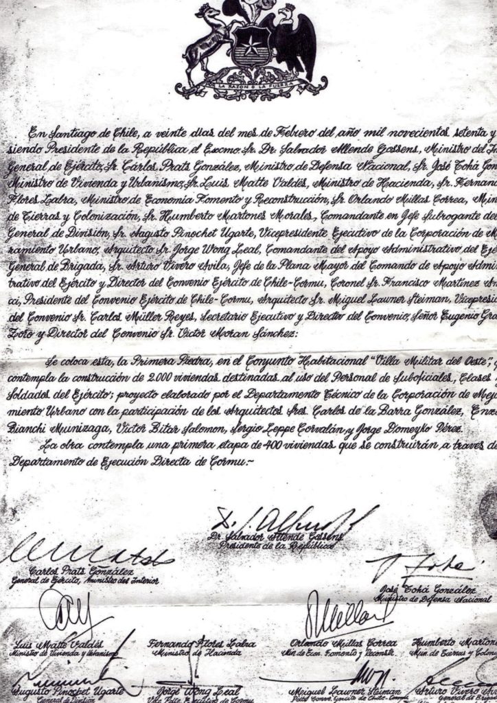 El 20 de febrero de 1973, se instaló allí la primera piedra en una ceremonia presidida por el Presidente Allende, con la presencia de varios ministros de estado, el general Carlos Prats, de Augusto Pinochet, quién firmó como Comandante en Jefe subrogante del Ejército, el Vicepresidente de la Cormu, arquitecto Jorge Wong, el general Arturo Viveros, en su calidad de Vicepresidente del Convenio Ejército de Chile-Cormu y yo, que firmé como Presidente de dicho convenio. Obra en mi poder una copia del pergamino instalado en dicha ceremonia, que atestigua la veracidad de todo lo que he afirmado.
