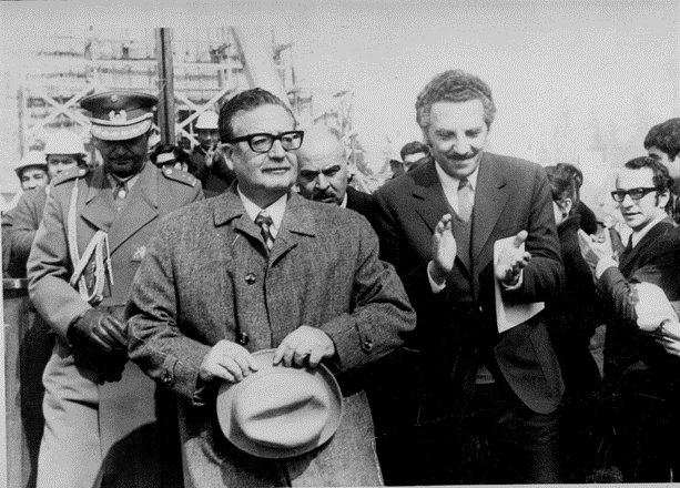 Febrero de 1972. Ceremonia de colocación de la primera piedra en Villa Militar del Este. De izquierda a derecha: General Oscar Bonilla, El Presidente Allende y Miguel Lawner.