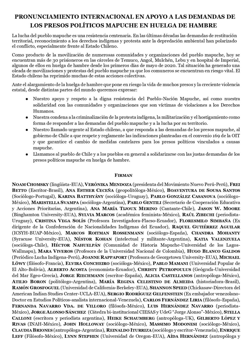 Todos estos se unen para manifestar su “apoyo y respeto a la digna resistencia del Pueblo-Nación Mapuche”, condenan la “criminalización de la protesta”, la “militarización y el hostigamiento” que sufren las comunidades, así como un llamado “urgente” al Estado y gobierno chileno para que “responda a las demandas de los presos mapuche” en huelga de hambre y a que “respete y reglamente las indicaciones planteadas en el convenio 169 de la OIT” con respecto a la prisión por causas indígenas.