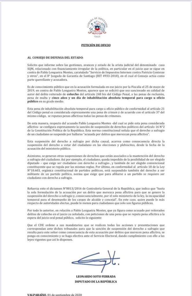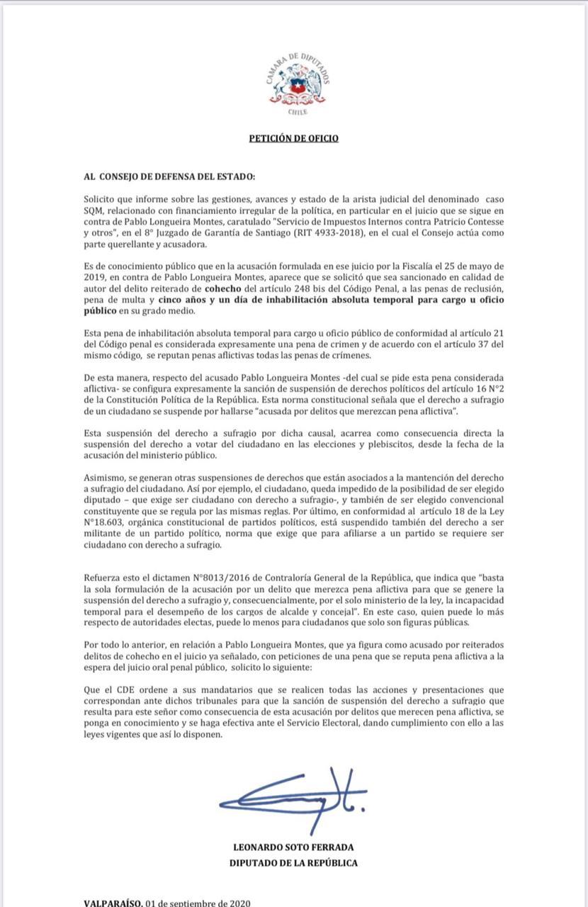 El diputado Leonardo Soto en un oficio enviado al Consejo de Defensa del Estado solicita que este organismo ordene a las instituciones correspondientes las sanciones judiciales contra el exsenador Pablo Longueira por el caso SQM en cuanto fue sancionado por cohecho y con la inhabilitación de ejercer cargos públicos y derecho a sufragio.