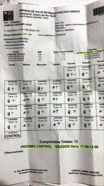 A la fecha indicada, el paciente solo había tomado Acenocuramol 4mg, prescrito por el Policlínico de Tratamiento Anticoagulante, donde lo atendieron durante 13 años.
