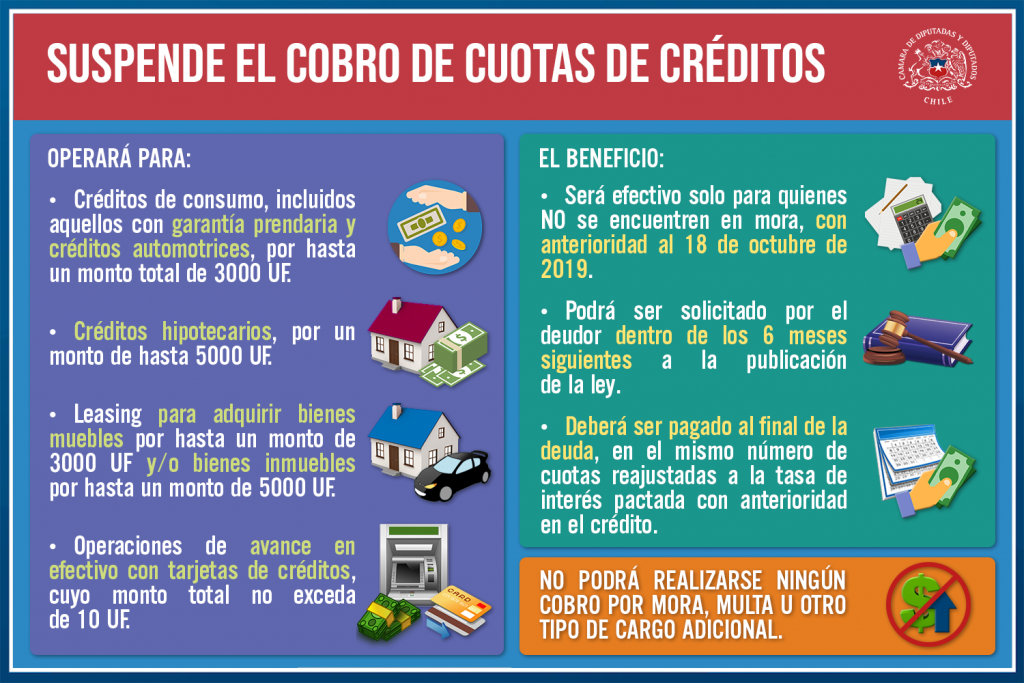 La norma, iniciada en mociones refundidas, va dirigida a personas naturales y pymes, que tendrán el derecho a solicitar la suspensión del pago de seis cuotas de créditos de cualquier naturaleza, suscritos con instituciones con acceso a la Facilidad de Liquidez con Incentivo al Crédito del Banco Central y por el monto otorgado por este.