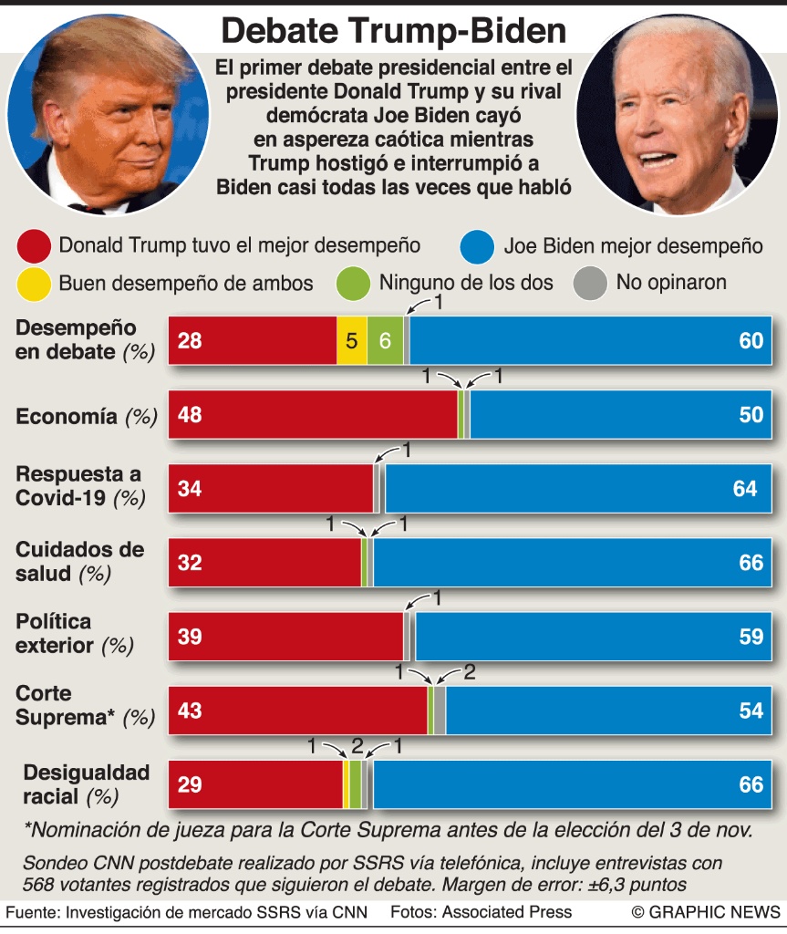 En el primer debate de los tres programados entre el candidato presidencial demócrata Joe Biden y el presidente republicano Donald Trump, ambos buscaron no cometer ningún error garrafal, pero para el mandatario era más urgente esta oportunidad con el fin de tratar de cambiar las tendencias en las encuestas que lo tienen entre ocho y 10 puntos abajo de su retador.