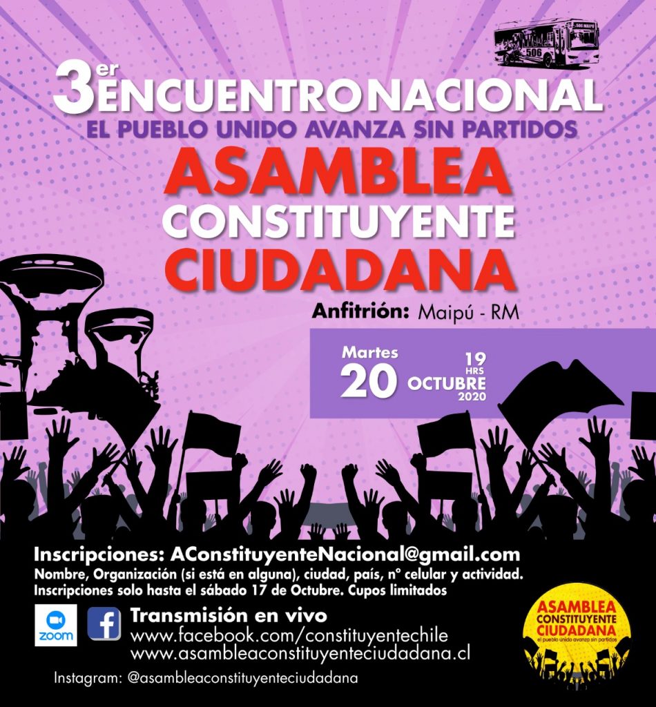 El próximo martes 20 de octubre, a las 19:00 horas, se llevará a cabo el Tercer Encuentro Nacional de la Asamblea Constituyente Ciudadana, esta vez con la comuna de Maipú como anfitriona del evento que se realizará vía Zoom y se transmitirá en línea a través del fanpage de Facebook @ConstituyenteChile.