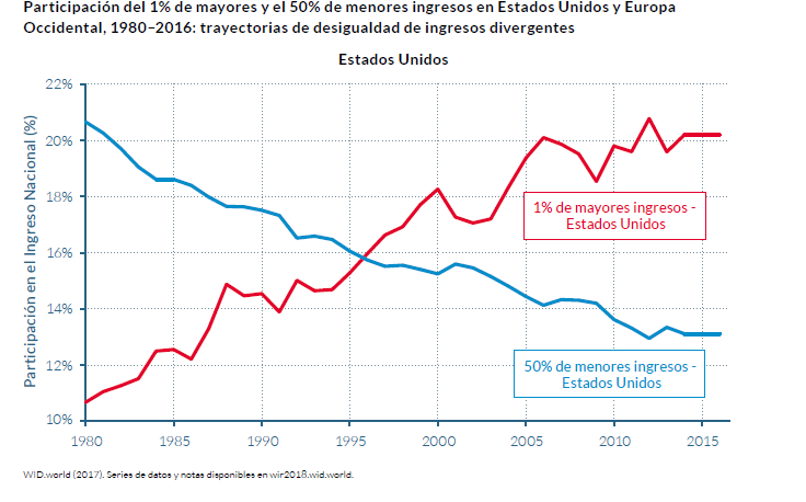 P. P. – Este es uno de los aspectos que creemos que es importante comprender porque pensamos que lo que está sucediendo en EE. UU. es bastante diferente de lo que está sucediendo en una serie de países europeos. Existen similitudes: un crecimiento del populismo de derechas, una sensación por parte de la clase trabajadora blanca de estar amenazada, una transformación racial o étnica, hostilidad a la inmigración o partes del país que se sienten abandonadas respecto a las elites urbanas. Este tipo de dinámicas son comunes en una serie de países pero en EE. UU está sucediendo en el contexto de un cambio realmente trascendental en la distribución de las recompensas económicas. Piketty y Saez demuestran que ha habido un cierto crecimiento de la desigualdad en muchos países. Sin embargo EE. UU. es un caso extremadamente atípico en términos de crecimiento de la cuota del uno por ciento superior y, en particular, el décimo superior del uno por ciento y la centésima parte superior del uno por ciento. El aumento de la plutocracia es mucho más pronunciado en EE.UU. que en el resto de los países. El Reino Unido, por el motor de su centro financiero, es la comparación más cercana pero sigue habiendo una gran diferencia. EE.UU es un caso extremo.