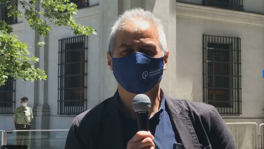 El presidente del Colegio de Profesores, Mario Aguilar, calificó de inaudita la determinación del ministro de Educación, Raúl Figueroa, quien excluyó del Consejo Asesor para el retorno a las aulas, al gremio docente y las comunidades escolares. “Estoy aquí al lado de la Moneda y desde aquí le digo a Piñera, a la Directora de la Unesco, al ministro de Educación que esa Comisión no tiene ninguna legitimidad, sino están representadas, los asistentes de la educación, profesores/as, profesionales de la educación inicial, padres y apoderados y los estudiantes”, expresó Aguilar, a viva voz .