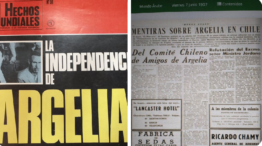 Un destacado rol tuvo el periódico Mundo Árabe sensibilizando a la opinión pública y a los sectores organizados frente a la represión y el genocidio perpetrado por la Francia colonialista en Argelia. Mundo Árabe fue el principal difusor en Chile del combate independentista argelino al que se fueron sumando medios progresistas como la Ultima Hora, El Siglo y El Clarín. La constante información sobre el conflicto argelino y la activa movilización de las organizaciones sociales y políticas solidarias con la autodeterminación argelina fueron muy importantes para contrarrestar el respaldo a la Francia colonialista, predominante en las elites y en los grandes medios de comunicación.[iii]