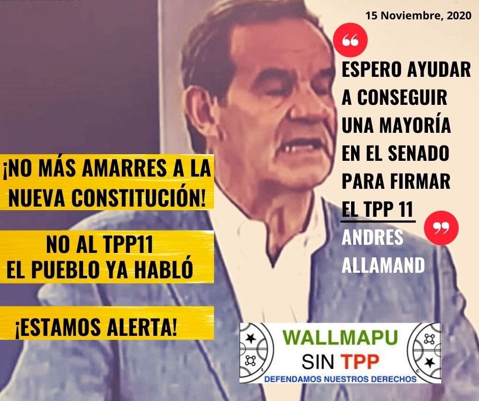 Este domingo el Ministro de Relaciones Exteriores Andrés Allamand nuevamente hizo público el interés del gobierno en que el Senado apruebe el Tratado Integral y Progresivo de Asociación Transpacífico o TPP-11, antes de que las/os delegadas/os constituyentes sean escogidos. Esta declaración por parte del canciller chileno, se da en el contexto en que Joe Biden, presidente electo de EE.UU, anunciara durante su campaña que reingresaría a este acuerdo comercial.