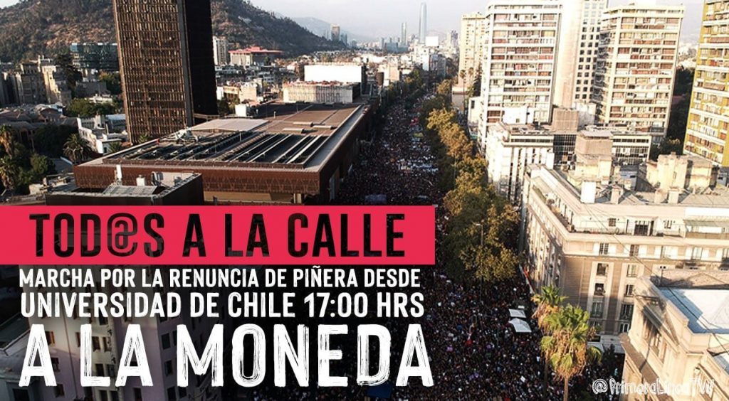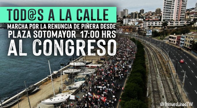La demanda popular por la renuncia de Piñera (a las 17:00 horas) se extiende también hacia el Congreso. Este lunes las diputadas Camila Vallejo (PC), Camila Rojas (Comunes), Pamela Jiles (PH), Alejandra Sepúlveda (FRVS) y Cristina Girardi (PPD) presentaron un proyecto para cambiar el alto quórum de 2/3 en la convención constituyente, que en los hechos le dará un poder de veto a la derecha, desatando una iracunda reacción en el partido del orden. Las dos derechas, la de siempre más la exconcertación y ahora sectores no menores del Frente Amplio, defendieron los pactos con la derecha. Desde la Democracia Cristiana calificaron de “chavista” el proyecto.
