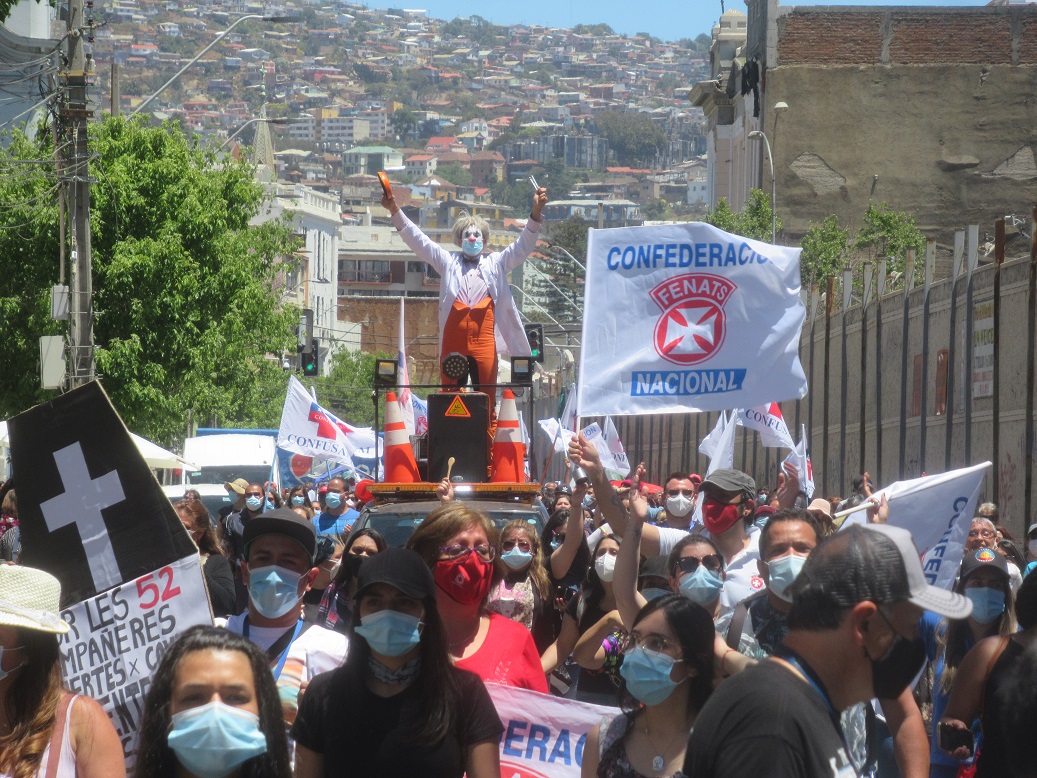 Mientras al interior del edificio legislativo la Cámara de Diputados debatía la anulación de la ley y un grupo de pescadores permanecía en el bandejón central de la Avenida Argentina escuchando el debate a través de sus celulares, alrededor de las 13 horas llegó hasta la puerta del Congreso Nacional ubicada por la calle Victoria, la marcha de los trabajadores de la salud proveniente desde la Plaza Sotomayor, quienes están movilizados desde la semana pasada y ayer lunes iniciaron una paralización indefinida, exigiendo mayores recursos para poder entregar una atención digna a los usuarios.
