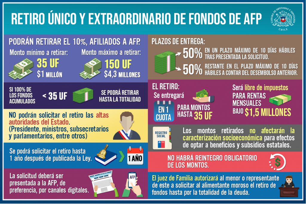 La propuesta legal establece que, excepcionalmente y en el contexto de la crisis sanitaria producida con ocasión del Covid-19, se autoriza a los afiliados del sistema privado de pensiones realizar, de forma voluntaria, un retiro por hasta el 10% de los fondos acumulados en su cuenta de capitalización individual de cotizaciones obligatorias.