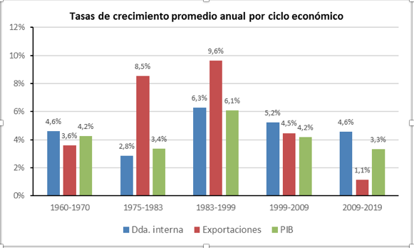En sus dos últimos ciclos, sin embargo, se aprecia ya una sensible y sostenida caída en las tasas de crecimiento de la economía. Las exportaciones pierden su rol de fuente dinamizadora de la actividad económica, para descansar esta derechamente en la demanda interna. De hecho, si se compara el último ciclo de la era “neoliberal” con el último de la fase desarrollista (1960-1970), el crecimiento de las exportaciones juega un rol aún menos relevante que en el de aquella época.