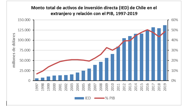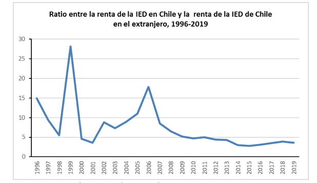 El fenómeno anterior tiene consecuencias directas en la forma en que la burguesía local establece sus relaciones con sus símiles extranjeras, y para lo cual el Estado hace de espaldas. En dicho sentido, si bien la renta de las inversiones extranjeras en el país aún supera a los réditos obtenidos por la burguesía local de sus inversiones en el exterior; la relación entre ambas, sin embargo, se ha estrechado significativa y constantemente en los últimos años. Así, si en 1996 las ganancias de los capitales extranjeros invertidos en Chile era cera de 15 veces el monto de lo que obtenían las inversiones del capital local en el extranjero, dicho ratio cayó a 3,6 veces en 2019 (gráfico n° 3).