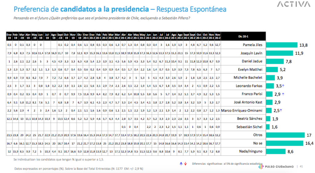 La encuesta Pulso Ciudadano de la primera quincena de diciembre indicó que la diputada del Partido Humanista, Pamela Jiles, se encuentra liderando las preferencias presidenciales, superando a Daniel Jadue, del Partido Comunista, y a Joaquín Lavín (UDI).