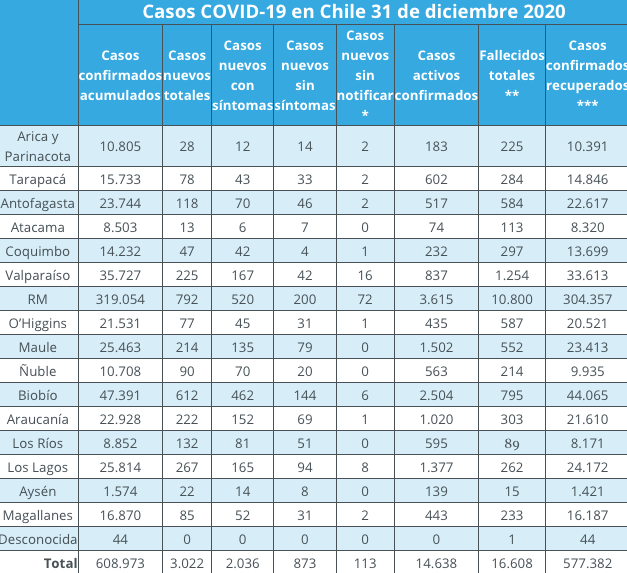 En cuanto a los decesos, de acuerdo a la información entregada por el Departamento de Estadística e Información de Salud (DEIS), en las últimas 24 horas se registraron 109 fallecidos por causas asociadas al COVID-19. Respecto de esta cifra, es importante considerar que esta se debe a la actualización de las inscripciones realizadas en el Registro Civil, las que se vieron afectadas en días anteriores debido al feriado y el fin de semana de Navidad, situación que durante estos días se ha ido regularizando, tal como se anticipó a principios de esta semana. El número total de fallecidos asciende a 16.608 en el país.