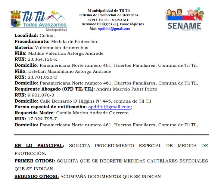 Como resultado de la denuncia presentada por Camila ante la alcaldesa de Tiltil, la Oficina de Protección de Derechos de la comuna ofició al Juzgado de Familia local con fecha 18 de enero pidiendo que se dicte una medida de protección a sus dos niños, quienes quedaron muy dañados luego de vivir el incidente relatado y presenciar la agresión de su padre contra la madre. Se piden medidas cautelares de eliminación o restricción de las visitas del padre a los dos niños.