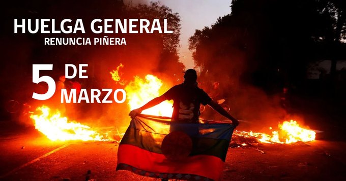 Diversas organizaciones y colectivos lanzaron esta mañana una convocatoria para una huelga general este 5 de marzo, la que tiene como objetivo presionar para la renuncia de Sebastián Piñera y poner fin a la violencia del Estado chileno, que solo durante la semana pasada se ha cobrado dos vidas.