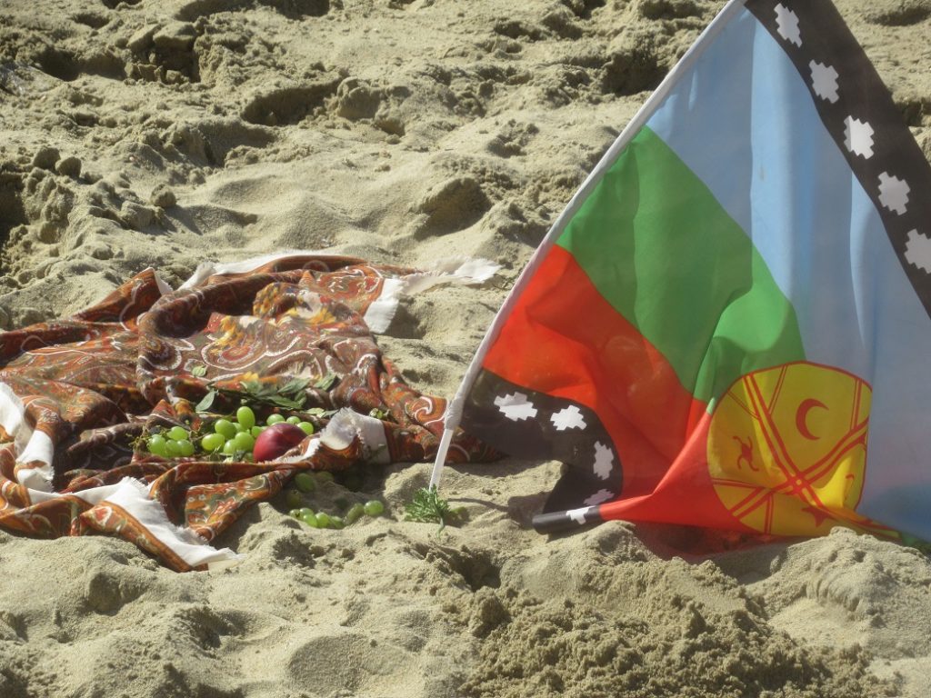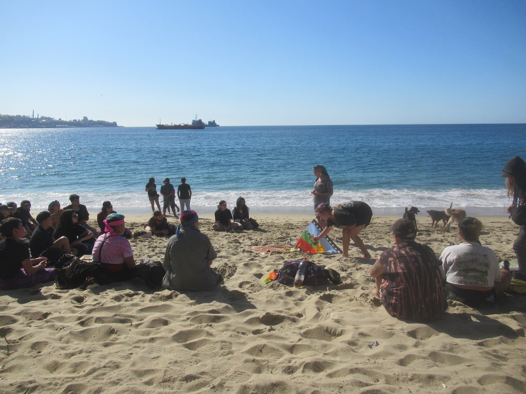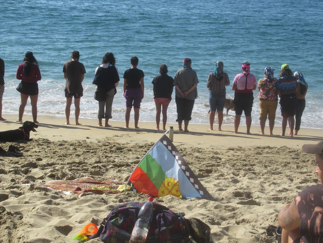 Sentadas en círculo en la arena y rodeando una bandera mapuche expresaron “(…) el dolor e indignación que sentimos es estos momento porque han asesinado a una de las nuestras. Una compañera comprometida con la lucha de recuperación en el Wallmapu (…) Este asesinato es también culpa de este Estado que favorece la política extractivista y depredadora del medio ambiente, favorece a la grandes empresas de todo tipo y también permite la destrucción de los espacios urbanos y rurales con la invasión inmobiliaria. Emilia, la Bau como también la conocemos, era una weichafe, una luchadora que estaba apoyando la lucha por la tierra y defendiendo la vida (…) En estos momentos, en distintos lugares, se están haciendo ceremonias similares a esta para despedir a nuestra lamnien y hemos querido venir junto al mar para recordarla y despedir su pülli, su espíritu…”