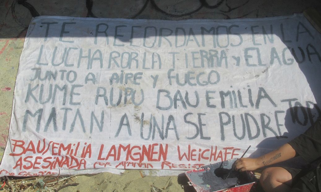 En parte de un Comunicado difundido a través de las redes sociales el Lof Llazcawe, expresó lo siguiente: ” queremos denunciar que el día de ayer casi a medianoche, fue asesinada por parte de los guardias sicarios del Condominio Riñi Mapu, nuestra lamngen Emilia, otres la conocían como Bau. Cayó por una bala disparada en su frente por parte de los propios guardias sicarios contratados por el condominio, quienes en ese momento estaban expulsando a unos campistas que se encontraban ahí, los que solicitaron ayuda ante la amenaza de estos sicarios…”