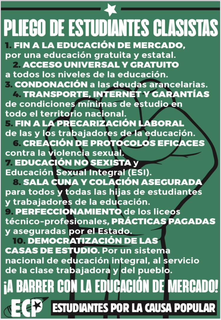 Como Estudiantes por la Causa Popular planteamos un pliego de demandas que responde a las necesidades imperiosas e inmediatas de lxs estudiantes, un punta pie inicial como brújula para la larga marcha que debemos emprender por conseguir nuestros derechos negados, la educación y la sociedad digna, libre y justa que queremos construir.