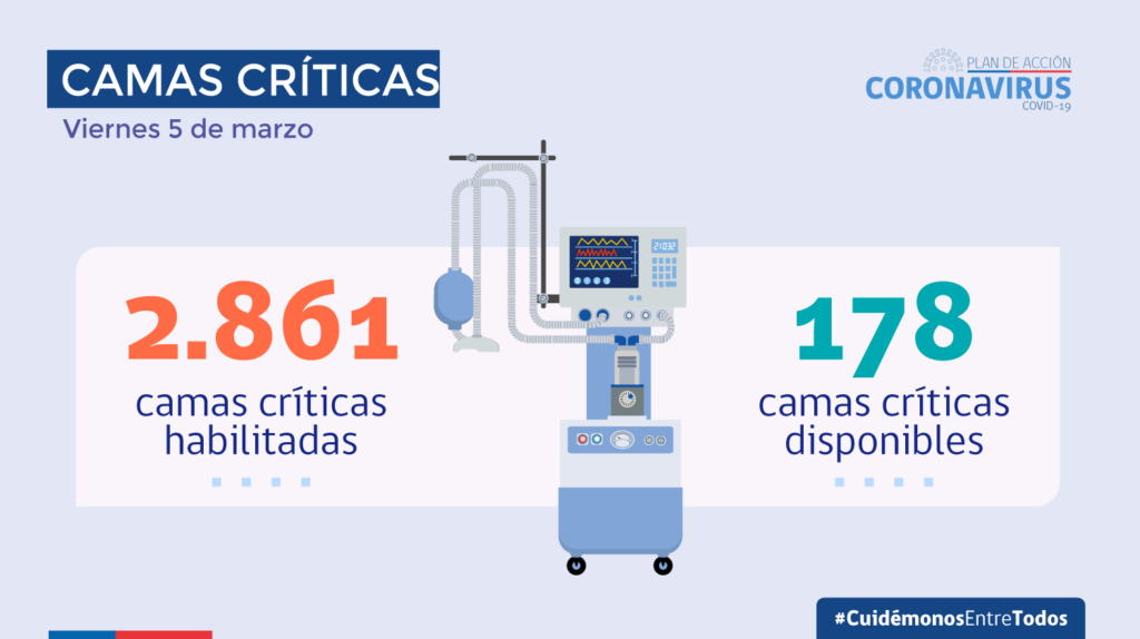 A la fecha, 1.755 personas se encuentran hospitalizadas en Unidades de Cuidados Intensivos, de las cuales 1.513 están con apoyo de ventilación mecánica. Con relación a la Red Integrada de Salud, existe un total de 178 camas críticas disponibles para el paciente que lo requiera, independiente de la región donde se encuentre.