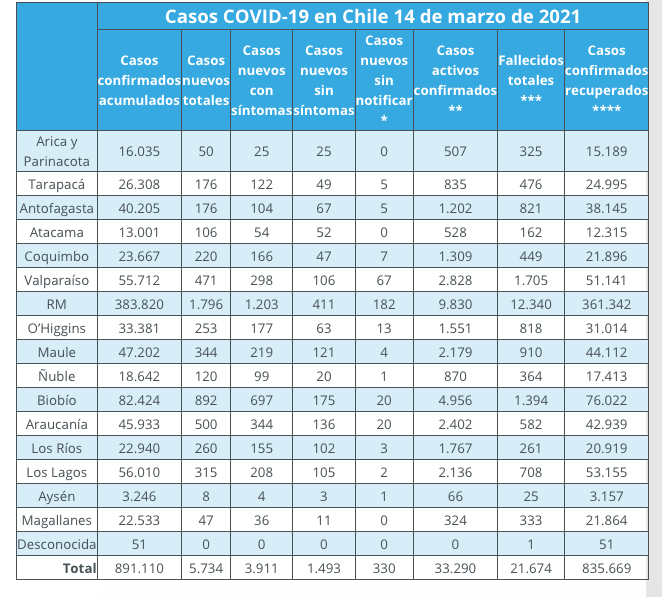 La cifra total de personas que han sido diagnosticadas con COVID-19 en el país alcanza a las 891.110. De ese total, 33.290 pacientes se encuentran en etapa activa. Los casos recuperados son 835.669.