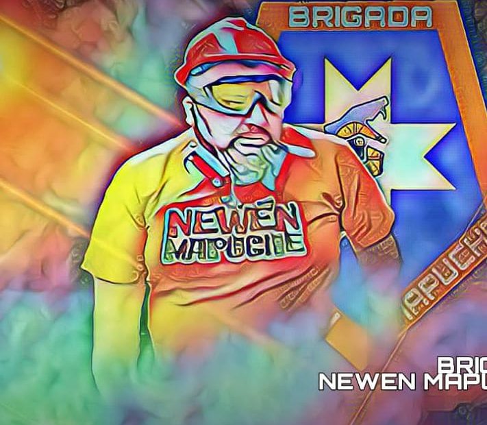 escudo pintado con un pincel que clama al cielo “Brigada NEWEN”,