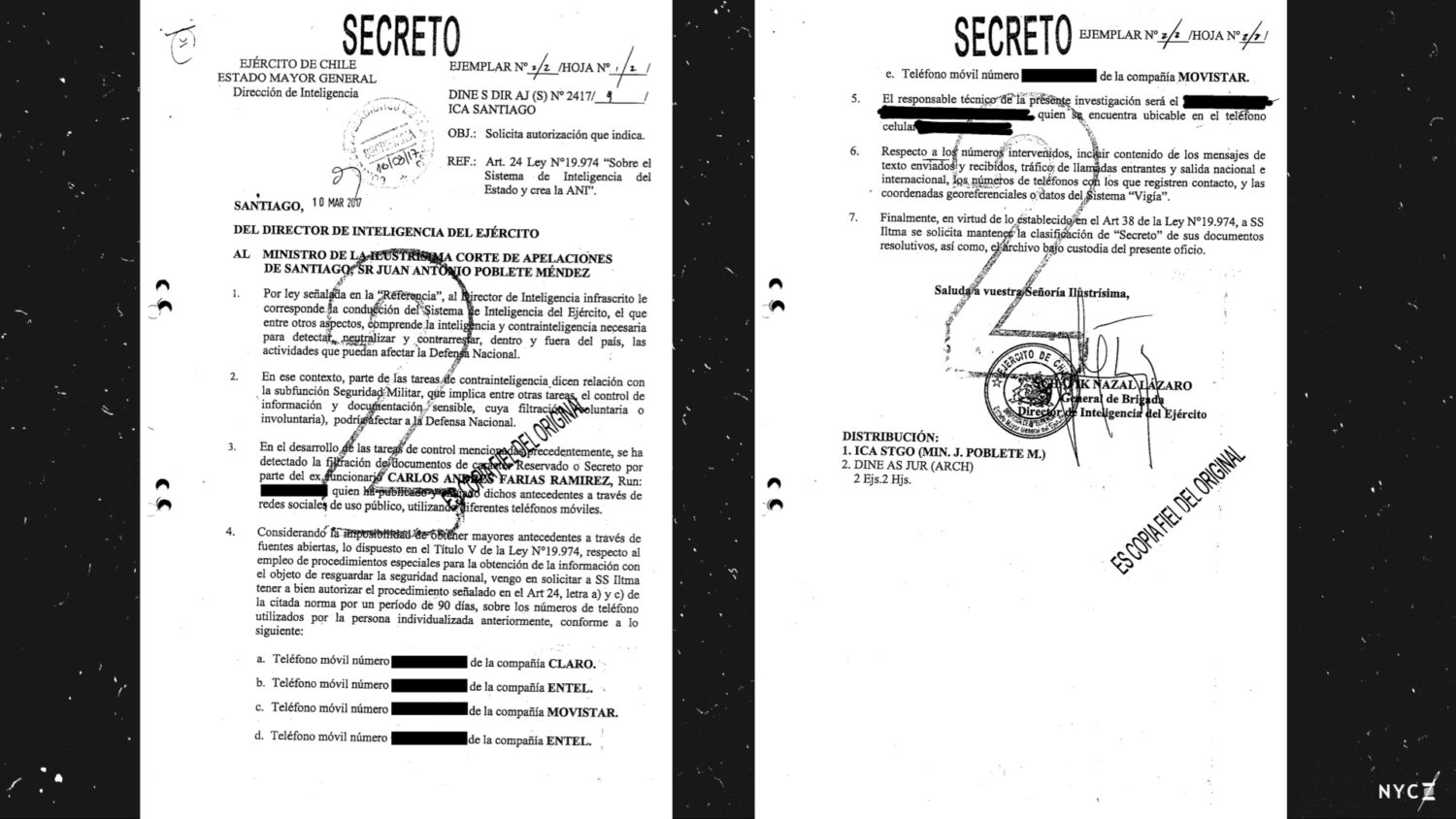 La copia del documento suscrito por el director de inteligencia y timbrado “SECRETO”, solicita a Poblete autorizar la intervención de 5 líneas de las compañías Claro, Movistar y Entel, además de registrar sus mensajes de texto, coordenadas de georreferencia y tráfico de llamadas.