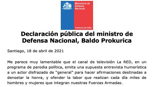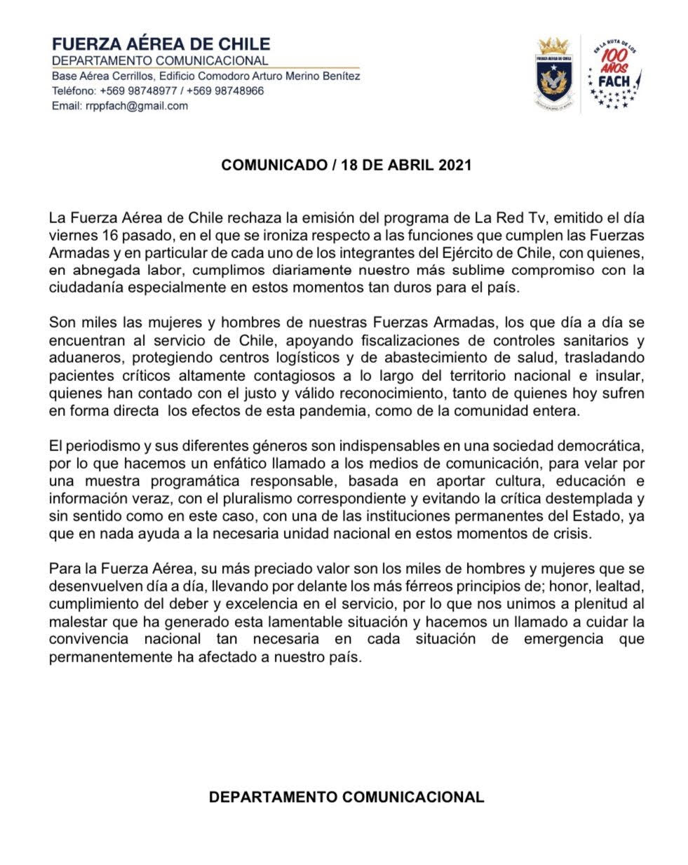 La Fuerza Aérea de Chile (FACH) emitió esta tarde una declaración pública en la que rechaza la sátira de los militares realizada el viernes en el programa Políticamente Incorrecto de La Red. Esta mañana ha sido el Ejército el primero en expresar su molestia por el programa del canal que dirige Víctor Gutiérrez. Horas más tarde, el Ministerio de Defensa se suma a este rechazo en lo que parece ser una acción concertada contra un medio de comunicación.