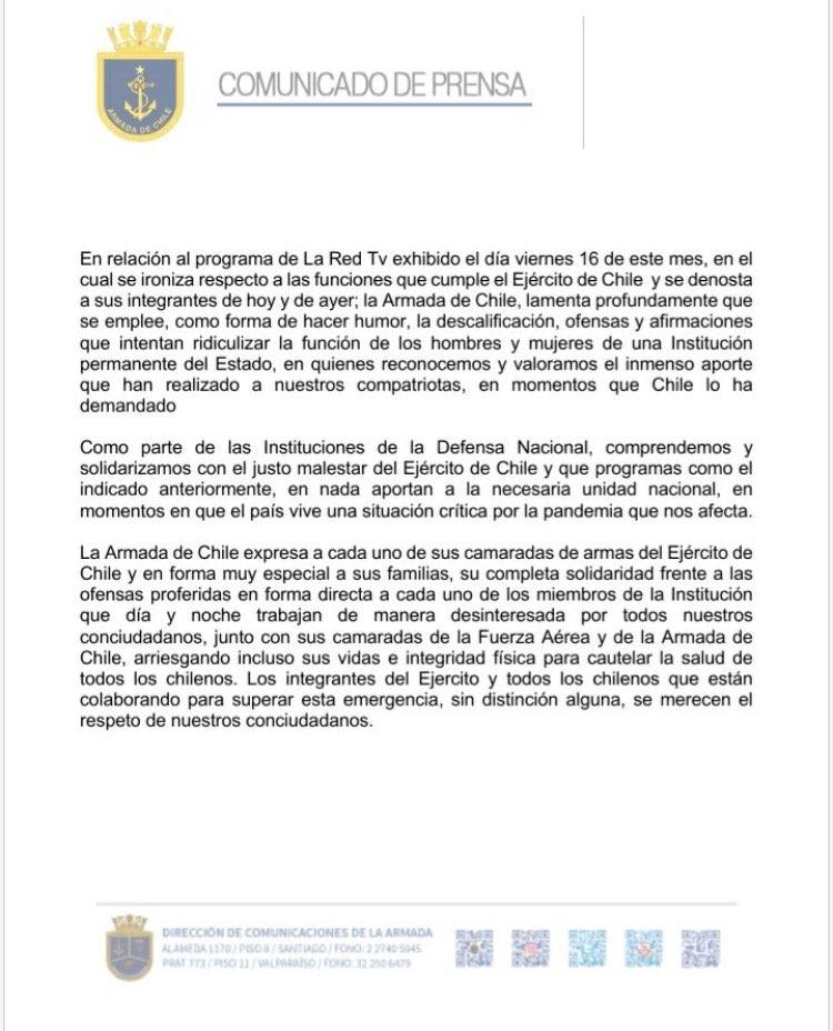 La FACH, la Armada y el gobierno se suman al Ejército para rechazar la sátira a los militares realizada en un programa de La Red