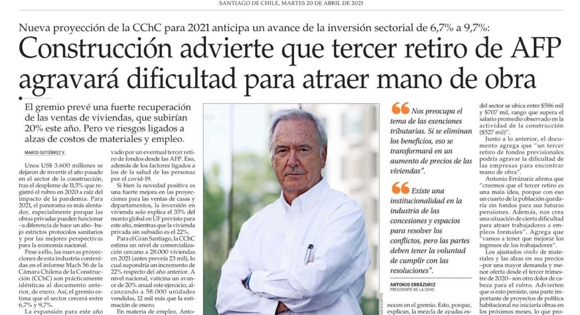Recientemente Antonio Errázuriz, presidente de la conspicua e influyente Cámara Chilena de la Construcción (CChC) manifestó públicamente que su sector económico «esencial»advierte que el tercer retiro de las AFP agravará la dificultad para atraer mano de obra a sus proyectos, algo similar a lo expresado por Ricardo Ariztía, presidente de la Sociedad Nacional de Agricultura (SNA), quien fue más brutal, pues suelto de cuerpo aseguró que las personas que buscan bonos de las autoridades no llegan a trabajar.