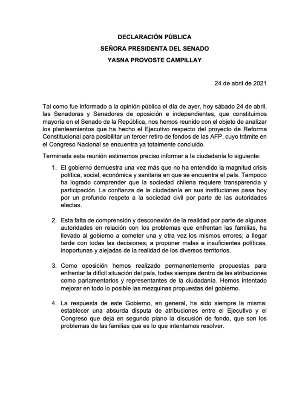 En una declaración, firmada por la presidenta del Senado, Yasna Provoste, en la cual se le recuerda e insiste a Piñera que este proyecto «se promulgue tal como fue aprobado por el Congreso Nacional».